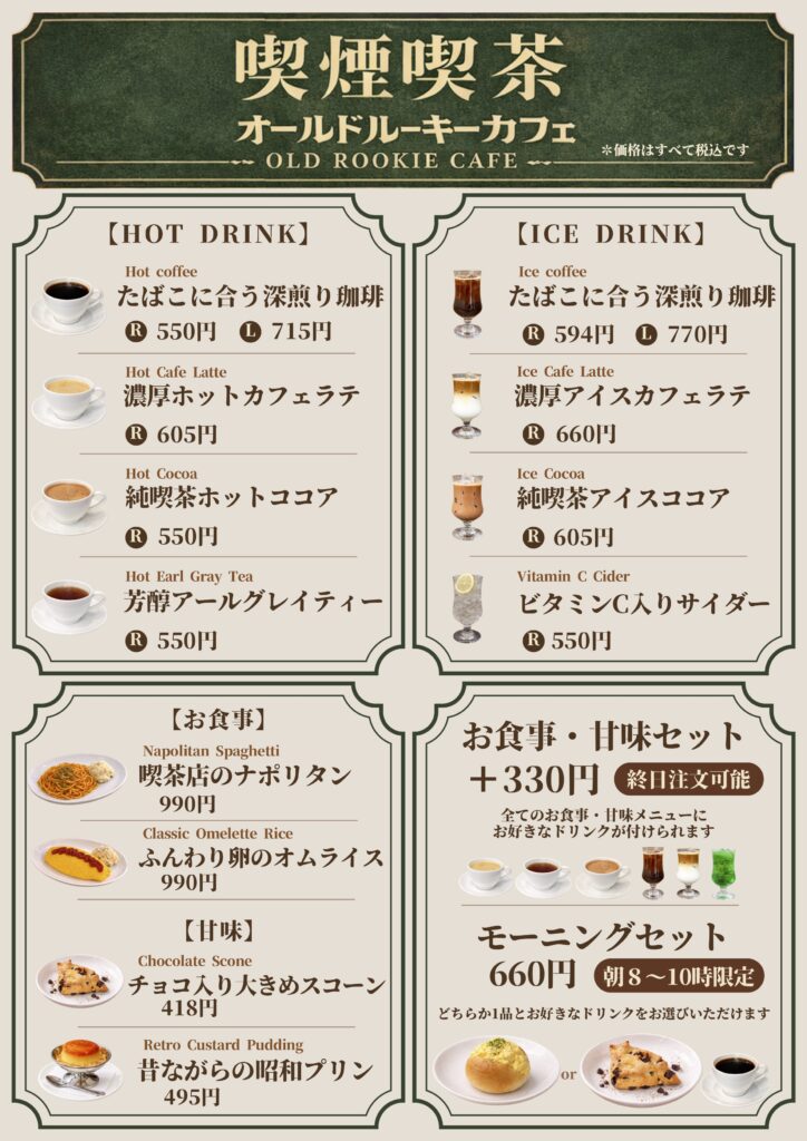見上げるビル群、行き交う人々。ビジネスの街・溜池山王で、本当に落ち着ける場所はどこだろう。その答えは、地下にありました。「喫煙喫茶オールドルーキーカフェ溜池山王店」が、オープンです。溜池山王店が何よりこだわったのは、充実のフード&ドリンク。お食事も楽しめる、新しいスタイルの喫煙喫茶です。紙巻き・加熱式たばこOK、全席電源・Wi-Fi完備、そして煙と匂いをものともしないパワフルな換気。愛煙家にとっての理想的な環境はそのままに、さらなる進化を遂げました。仕事の一服に、集中したい時間に、そして美味しい食事に。新しいオールドルーキーカフェで、あなただけの時間をお過ごしください。